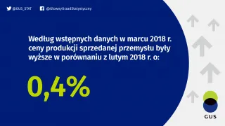 Według wstępnych danych w marcu 2018 r. ceny produkcji sprzedanej przemysłu były o 0,4% wyższe w porównaniu z lutym 2018 r. Wyższe były także ceny produkcji budowlano-montażowej - o 0,2%.