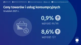 Ceny towarów i usług konsumpcyjnych w grudniu 2021 r. w porównaniu z analogicznym miesiącem ub. roku wzrosły o 8,6% (przy wzroście cen towarów – o 9,0% i usług – o 7,6%). W stosunku do poprzedniego miesiąca ceny towarów i usług wzrosły o 0,9% (w tym towarów – o 1,0% i usług – o 0,7%). Wzrost cen towarów i usług konsumpcyjnych w 2021 r. w stosunku do roku poprzedniego wyniósł 5,1%.